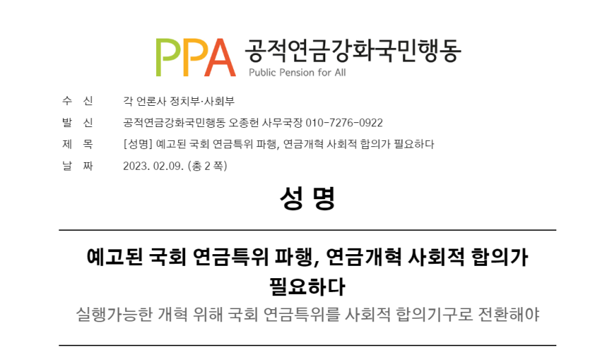 [연금행동 성명] 예고된 국회 연금특위 파행, 연금개혁 사회적 합의가 필요하다