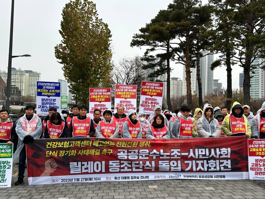 공공운수노조와 시민사회단체가 27일 용산 대통령집무실 앞에서 건강보험고객센터지부 지부장 단식 30일 이전 사태해결을 촉구하는 릴레이 동조단식 기자회견을 열고, 조속한 소속기관 설립과 건강보험고객센터 노동자 해고 없는 전원전환을 촉구했다.