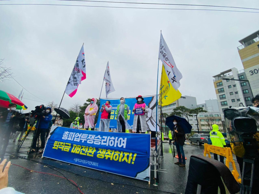 교육공무직본부는 오래전부터 서울교육청에 노동자들의 노후생활을 위한 퇴직연금 제도 개선을 요구해왔다. 그 결과 작년 퇴직연금제도 개선을 위한 협의체를 만들기로 합의했고, 올해 퇴직연금제도 운영 개선 특별기구를 운영했다. 그러나 9~10월에는 끝났어야 할 협의회 결과는 여전히 오리무중이다. 본부는 ‘각종 언론에서도 퇴직연금 DC형(확정기여형)의 피해사례를 이야기하며 노동자들에게는 DB형(확정급여형)이 적합하다고 말한다. 어느 지역도 서울만큼 DC형의 비율이 높은 곳이 없다. 퇴직연금제도 개선만큼은 더 미룰 수 없다. 올해 꼭 해결해야 한다’고 강조했다.