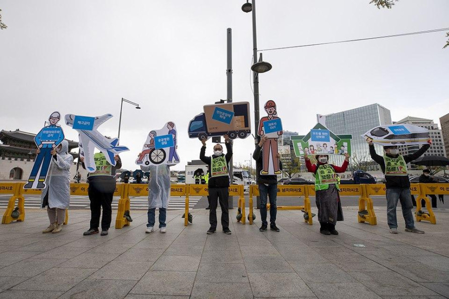 오는 28일 ‘세계 산재사망 노동자 추모의 날’을 앞두고 22일 전경련, 서울역, 서울교육청, 광화문우체국, 서울대병원, 서울고용노동청, 금호아시아나를 거쳐 정부종합청사 앞에서 섰다. 공공운수노조 조합원들은 ‘정부에 위험의 외주화 금지, 산안법 개정 및 코로나19 경제위기를 노동자에게 전가 시키지 말라“고 요구하며 공동행동에 나섰다.
