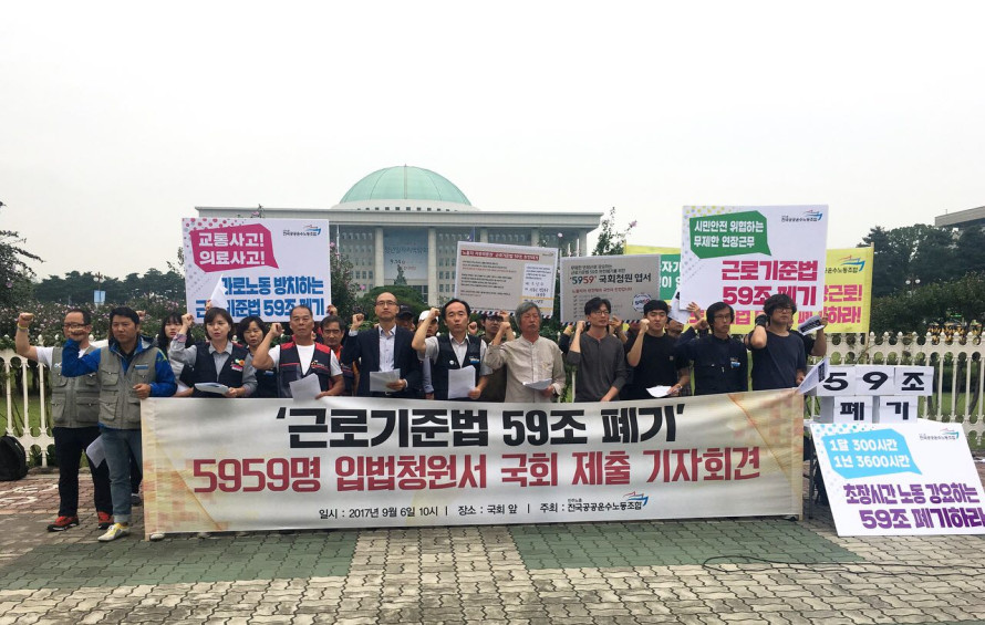 근기법 59조 폐기, 5,959명 입법청원 기자회견 공공운수노조는 국민의 안전과 노동자의 건강을 동시에 위협하고 있는 근로기준법 59조 폐기를 원하는 현장 노동자와 시민의 목소리를 담아 국회 입법청원 기자회견을 9월 6일 국회 정문 앞에서 열었다. 최근 대형버스 참사가 끊이지 않고 있어 국민 불안이 가중되고 지난 주말에만 세 건의 버스사고로 18명의 노동자와 시민이 죽거나 다친 바 있다. 노조는 기자회견을 통해 사고를 근절하겠다는 정부의 대책이 결국 아무런 실효가 없었다는 것이 확인되고 있다며 이는 졸음운전 문제 해결을 위한 노동시간 규제를 사실상 하고 있지 않은데서 기인하다고 밝혔다.
